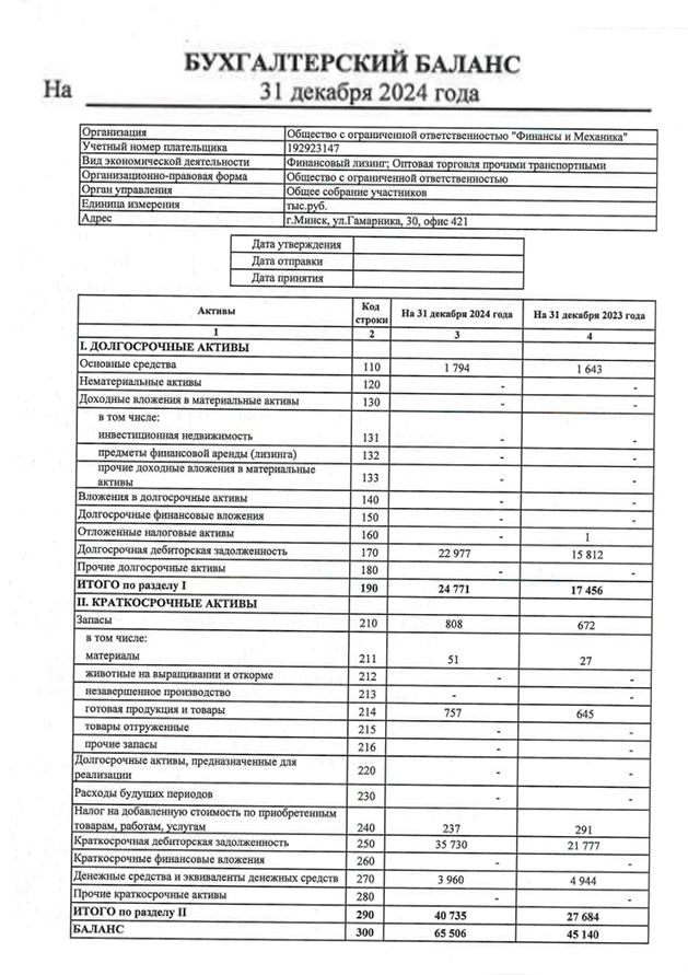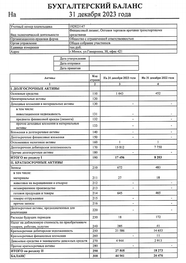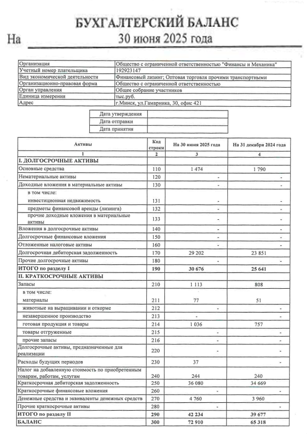 - Бухгалтерский баланс на последнюю отчетную дату и за предыдущий календарный год - Отчет о прибылях и убытках на последнюю отчетную дату и за предыдущий календарный год - Согласие на предоставление кредитного отчета - Анкета лизингополучателя - Копии договоров заключаемых лизингополучателем в процессе своей коммерческой деятельности - Копии правоустанавливающих и удостоверяющих документов - другие документы при необходимости